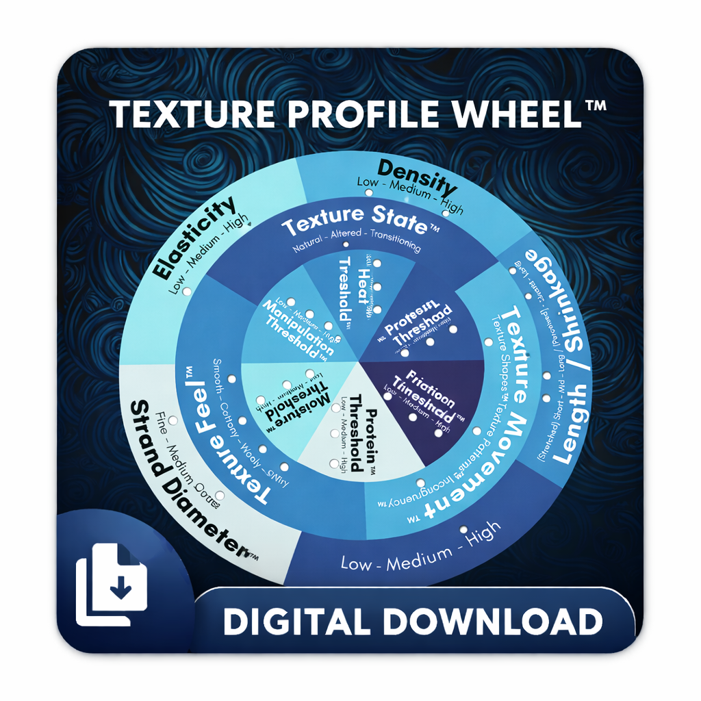 Built on the Texture Dynamics Framework, this wheel organizes hair into three essential pillars: • Hair Properties (what your hair is) • Texture Indicators™ (how your hair behaves) • Hair Thresholds™ (what your hair can tolerate)